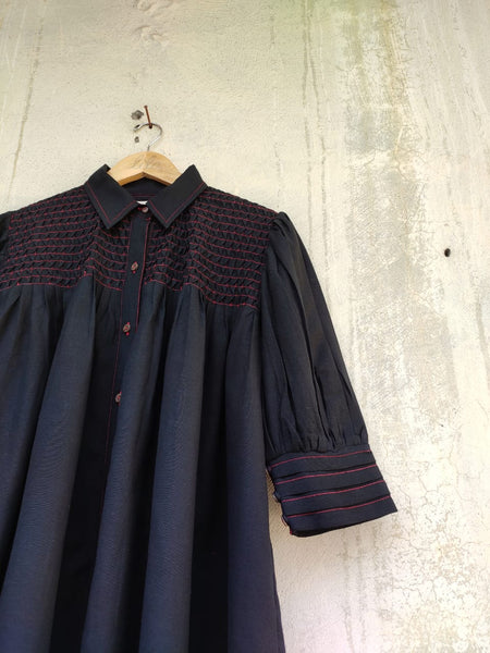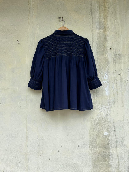 The Vrinda Top is a must have piece, it’s details stand out and make it piece that you would want to wear and pair with anything. Smocking details in front and back make the top an interesting piece to wear out. With sharp collars and front open - it provides the chic, the smocking opens up to give it room and comfort. Sleeves till elbow finish with a panelled detail.